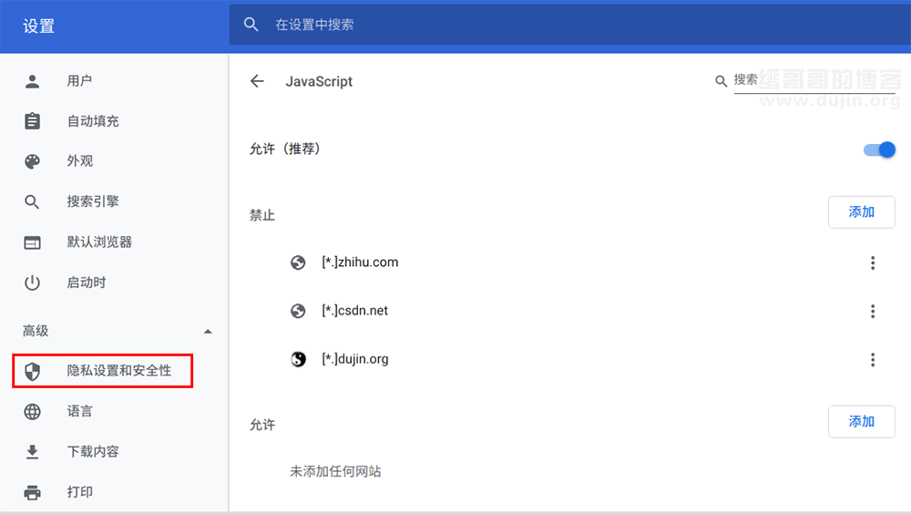 点击高级→隐私设置和安全性→网站设置→JavaScript,在禁止处添加不让复制,或者复制有后缀的网站网址