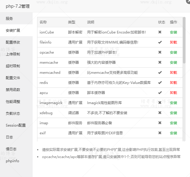 然后进入宝塔,进入PHP管理,安装扩展,分别把:fileinfo、memcached、redis、apcu,还建议把opcache也装上。
