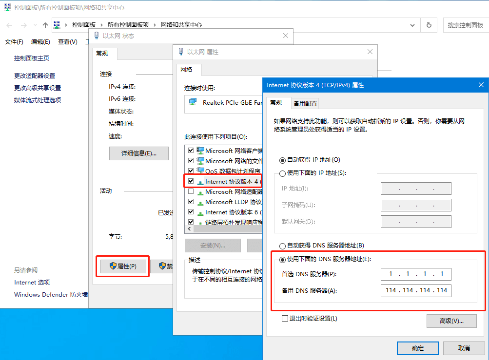 打开网络和共享中心--点击当前的连接--属性--Internet协议版本4(TCP/IPv4)属性--使用下面的DNS服务器地址--填入首选和备用DNS地址,确定就OK了。