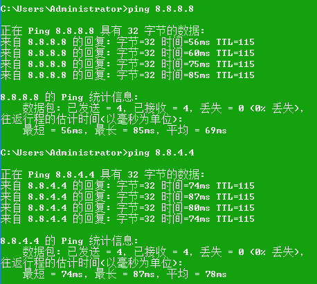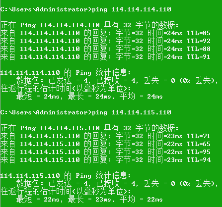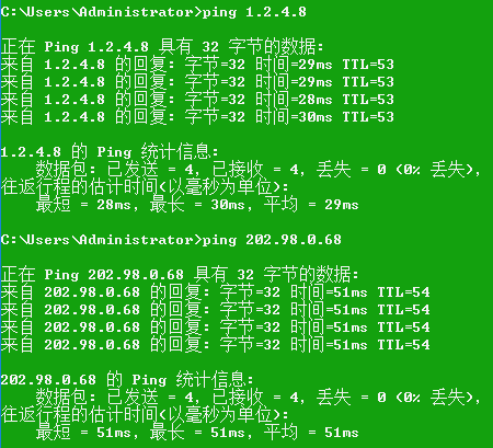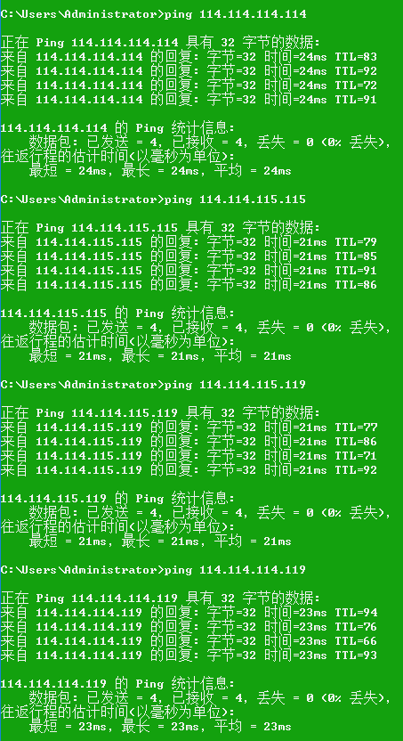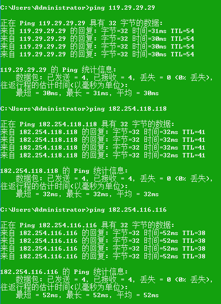 每个地方测试的解析速度都不一样,以本地测试速度为准。简单测试方法上面CMD ping DNS地址,平均时间越小越好,“TTL”越大越好。