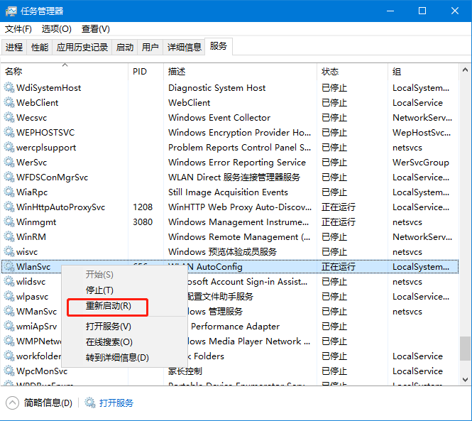 打开“任选管理器”,转到“服务”,找到“WlanSvc”右键重新启动之后就正常了。