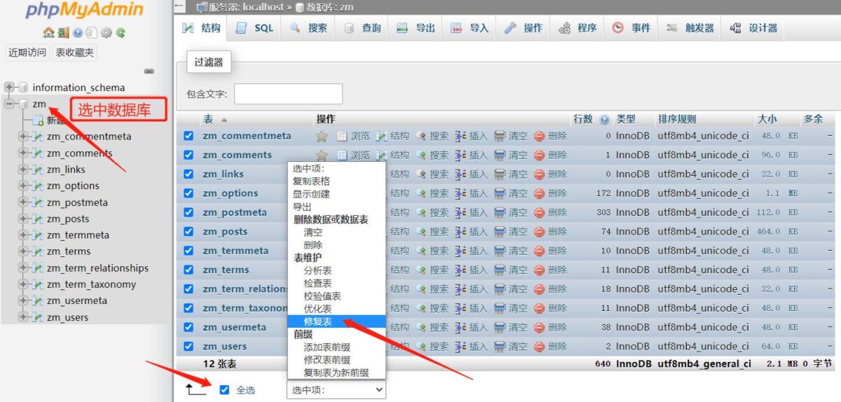 登陆phpMyAdmin后,点击左边需要修复的数据库。右边会列出数据库所有表,选择损坏的表或者将页面拉到最下面,点击全选,下拉框中选择修复。