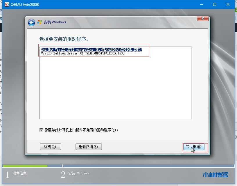 点击“加载驱动程序”,点击“浏览”。在光驱中,我们可以看到有两个光驱D盘和E盘。其中D盘式系统的镜像文件,而E盘则是virtio的驱动程序。点击E盘—“WLH”—“AMD64”,如下图: