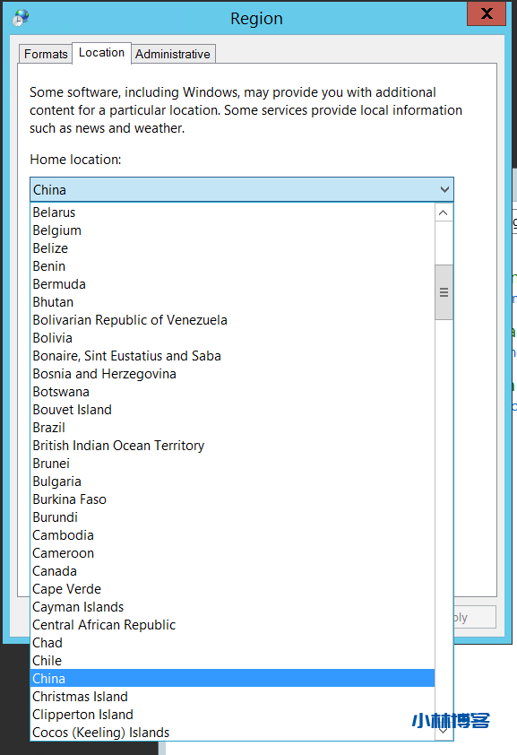 在打开的“Region”窗口中的“Location”子窗口下选择“Home location”里的China