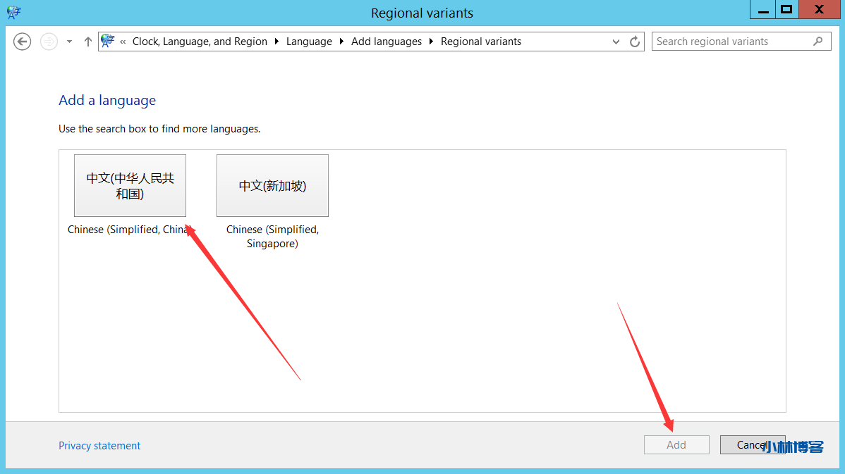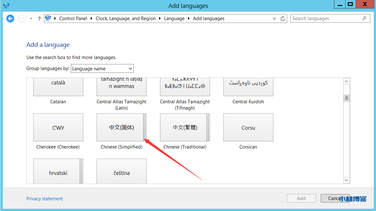 在这个页面中下拉滚动条找到 简体中文 后,选中并点击“Add”