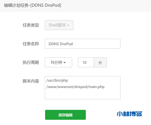 DNSpod 免费版 TTL 最短时间是 10 分钟,配合宝塔的计划任务,挂个间隔 10 分钟的任务刚刚好。
