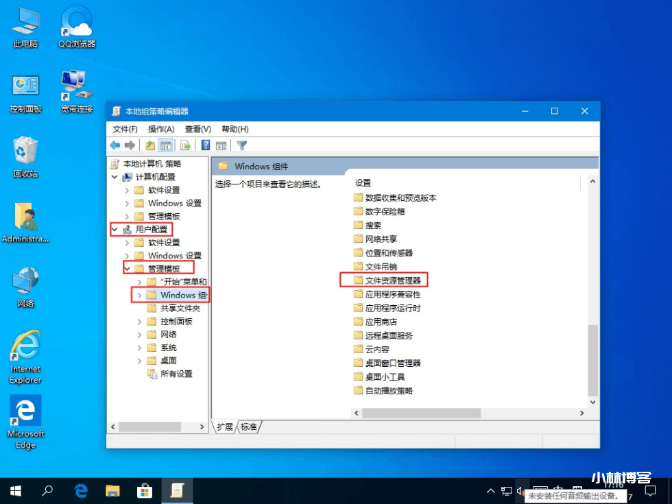 第二步:打开“用户配置”-“管理模板”-“Windows组件”-“文件资源管理器”。