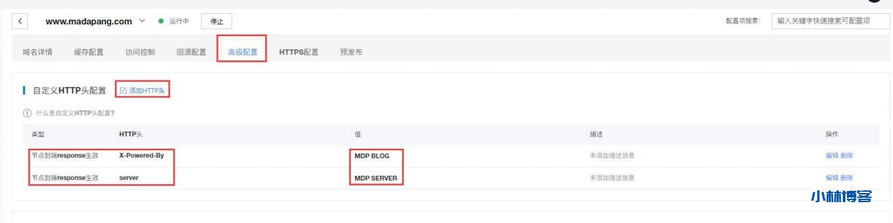 (找到内容分发网络CDN——选中域名点击管理——高级配置——自定义HTTP头配置——添加HTTP 头——自定义参数输入(Server和X-Powered-By)——输入取值(要改的值))下面的是我自己改好的