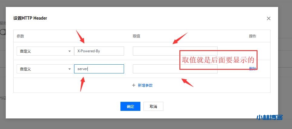 (找到内容分发CDN——选中域名点击管理——高级配置——HTTP Header 配置——添加HTTP Header——自定义参数输入(Server和X-Powered-By)——输入取值(要改的值))