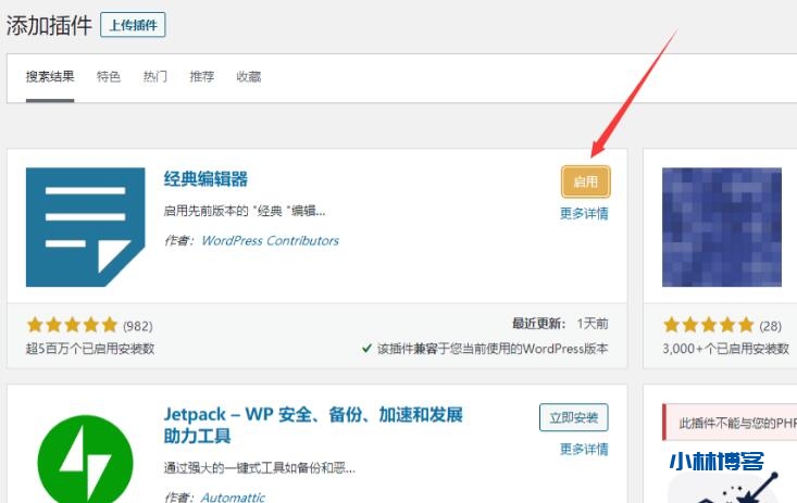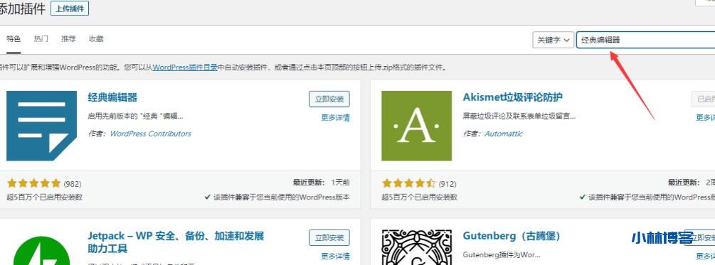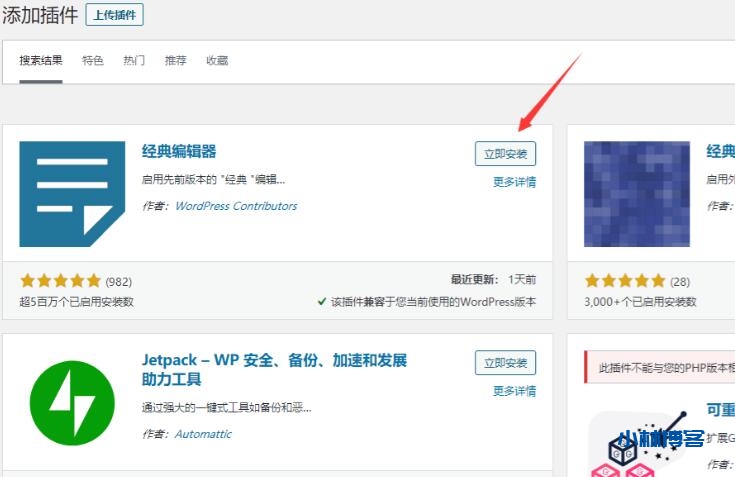 3,在弹出的搜索结果页中,你就可以看得到第一个插件就是经典编辑器,点击立即安装,然后页面上就会显示正在安装。