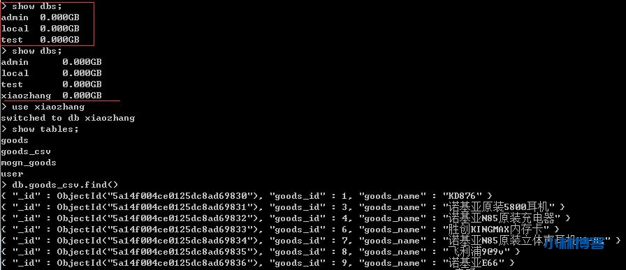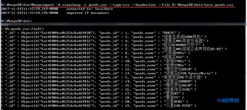 Mongoimport -d xiaozhang -c mong_goods --file D:\MongoDB\data\test.goods.josn