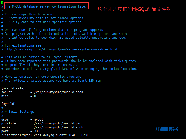 去这2个目录下找找呗,恩,上天垂爱,原来真正的配置文件在/etc/mysql/mysql.conf.d的目录下,就是mysqld.cnf文件,执行命令sudo vim /etc/mysql/mysql.conf.d/mysqld.cnf
