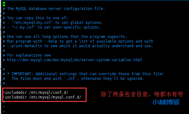 怎么修改MySQL的配置呢?网上的很多版本都在讲找/etc/my.cnf,或者/etc/mysql/my.cnf进行配置。ls /etc/my.cnf没有结果,/etc/mysql/my.cnf倒是有,通过sudo vim /etc/mysql/my.cnf打开一瞧,啥都木有啊