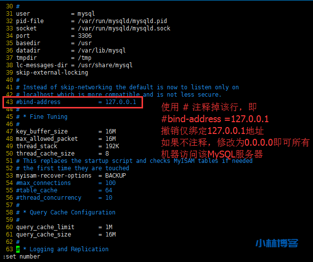 使用#注释掉bind-address=127.0.0.1,撤销仅绑定127.0.0.1地址,如果不注释,修改为0.0.0.0即可所有机器访问该MySQL服务器。