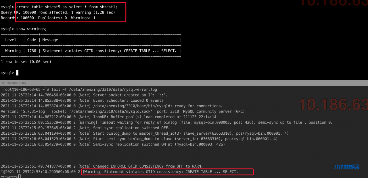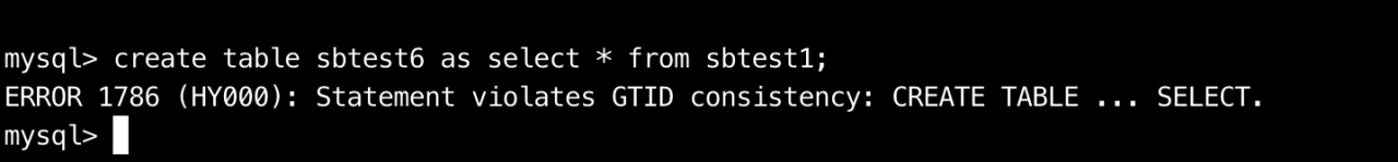 观测一段时间(严谨的情况可能观测一天以上),确认上一个步骤未在错误日志中出现相关Warning信息后,正式开启GTID一致性校验,当设置为ON后,如果再执行CREATE TABLE AS SELECT语句则会直接报错