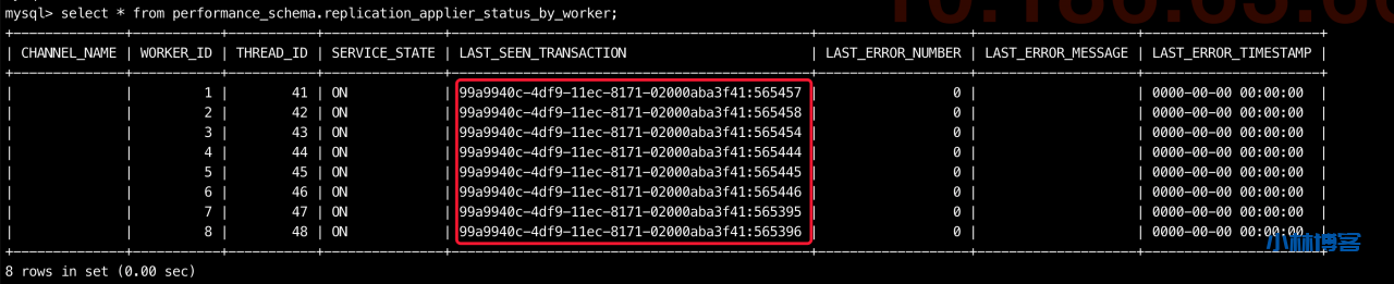 观测GTID_OWNED状态变量变为空值及replication_applier_status_by_worker表中事务均转为匿名事务