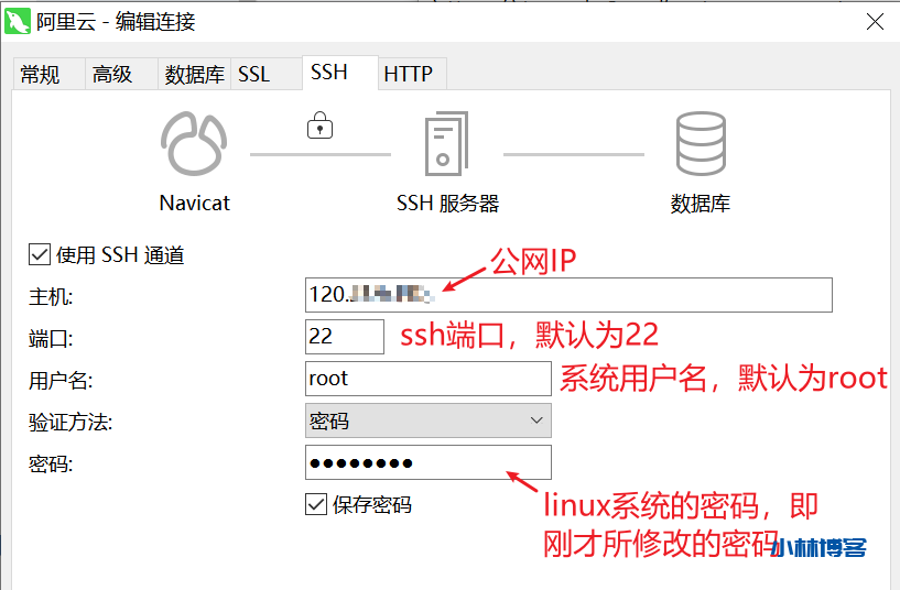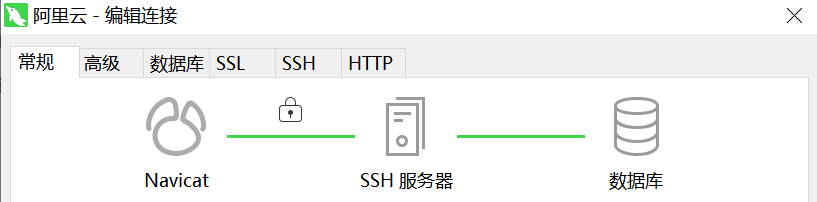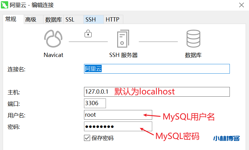 然后打开navicat新建连接。这里和一般连接数据库不一样,因为它是需要先进行ssh连接连接到服务器的系统上,再使用localhost连接到MySQL上的,即: