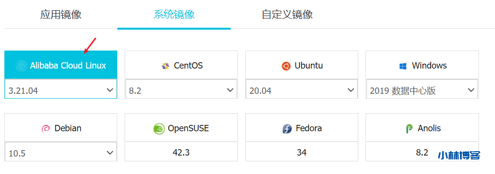 不过直接使用镜像也有一定的缺点,即使用了它之后也就绑定了你需要使用阿里巴巴提供的Linux系统,可能会对之后的操作不便,因此应用镜像应看情况使用。阿里巴巴的Linux系统如下所示: