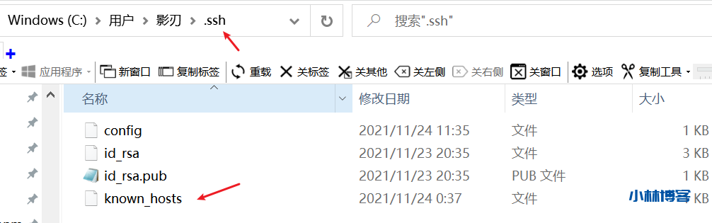 但重置系统等操作会造成原来的连接不可用,此时就需要来到C:/User/.ssh/目录:
