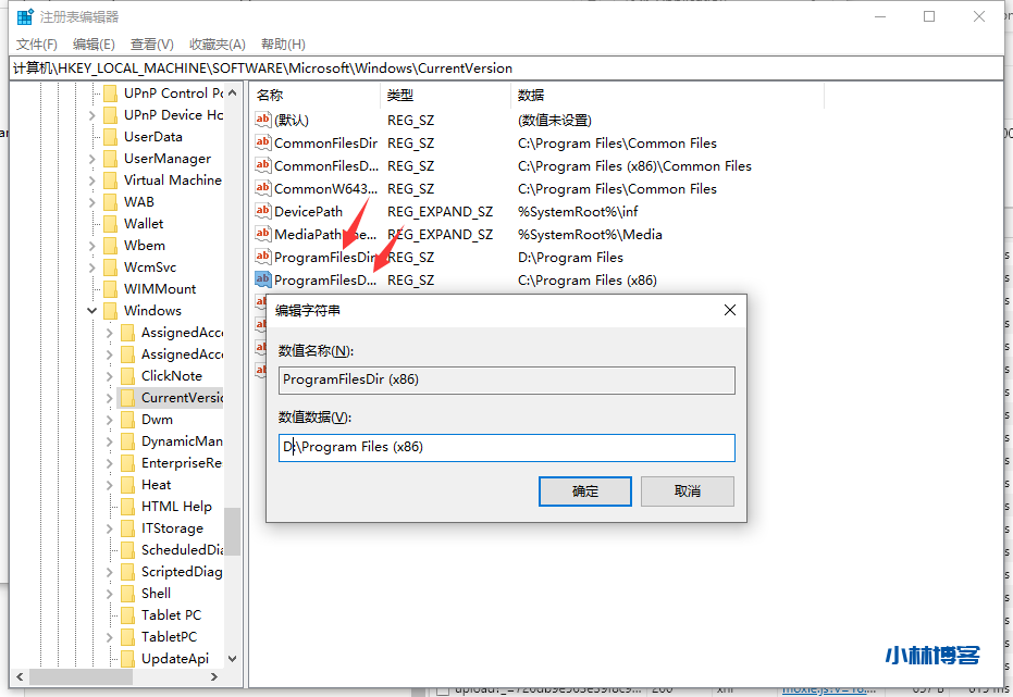 4、 把注册表里面的带有C盘符的改成D或者其他盘符即可,双击打开ProgramFilesDir,在数值数据修改自己想要设定的默认安装目录,盘符要注意是输入大写字母