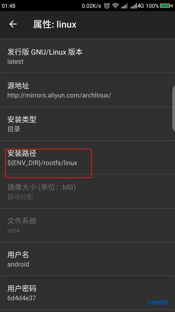 ${ENV_DIR},这代表的是存储空间根目录。如要安装在sdcard中,则加上${EXTERNAL_STORAGE}。 - 用户名和密码自定义,本地、远程连接该系统用。