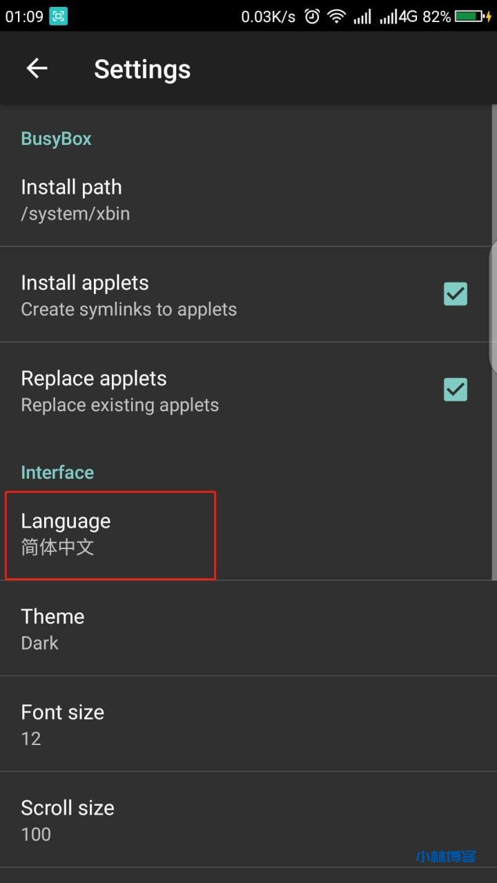 P S:Busy Box默认界面语言是英文,可以改成中文,点击右上角部分,在弹出的菜单中选择Settings,接着进入设置界面,找到Language项,点击后选择简体中文,退出设置界面后界面语言就改为中文了。