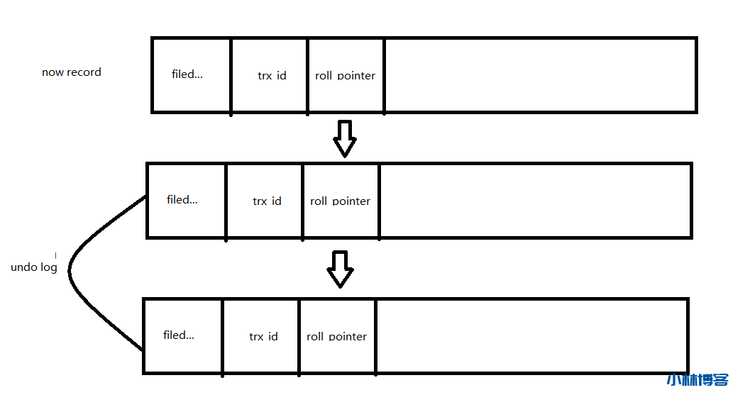 版本链式用来存储该数据行的历史,每次对记录进行更新后,都会将旧值放到一条 undo日志 中,形成该记录的一个旧版本,随着更新次数的增加,所有版本都会被数据行的 roll_pointer 属性连接成一个链表,我们把这个链表称之为版本链,版本链的头节点就是当前记录的最新值。另外,每个版本还包含生成该版本的 事务ID ,大概逻辑如下图所示: