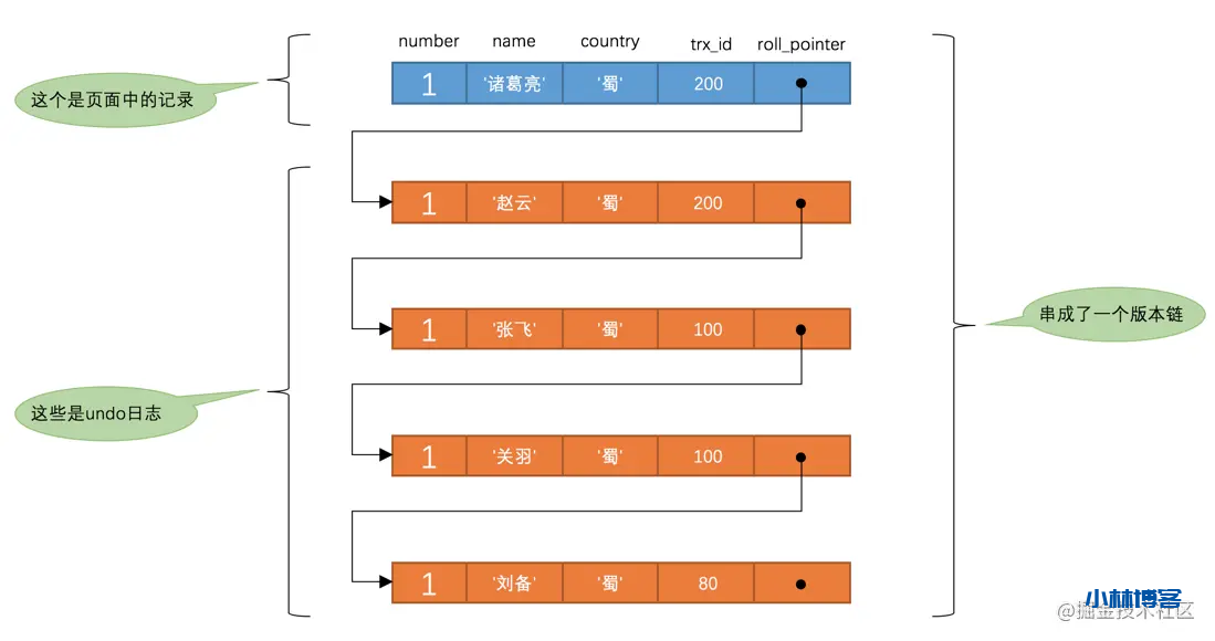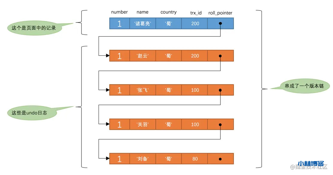 name的内容是'诸葛亮',该版本的trx_id值为200,在m_ids列表内,所以不符合可见性要求,根据roll_pointer跳到下一个版本。 - 下一个版本的列