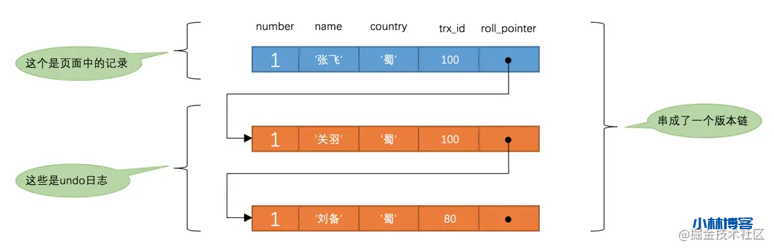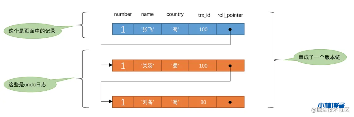 此刻,表hero中number为1的记录的版本链就长这样: