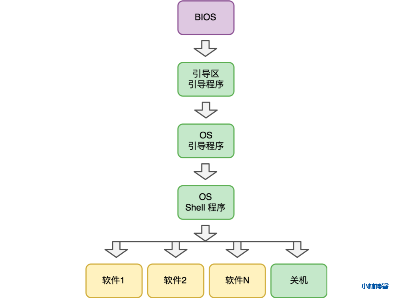 OS 引导程序,则是外置存储接手计算机控制权的真正开始。这里 OS 是**操作系统(Operating System)**的缩写。操作系统从这里开始干活了。这个过程发生了很多很多事情,这里我们先略过。但是最终所有的初始化工作完成后,操作系统会把执行权交给 OS Shell 程序。