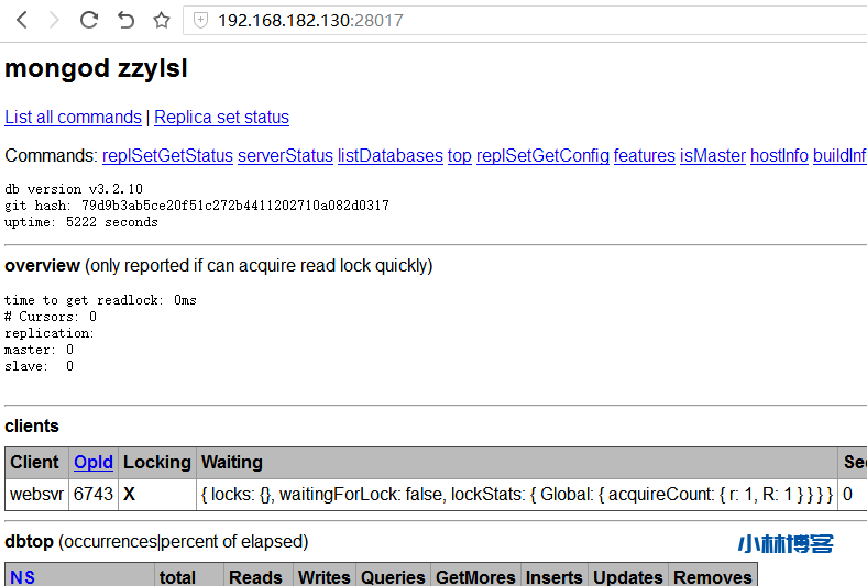 启动后,默认的web管理端口是28017,这时候访问http://ip:28017即可看到管理界面