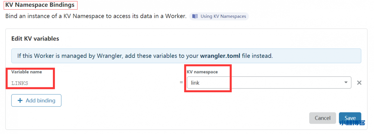 其中Variable name填写LINKS, KV namespace填写你刚刚创建的命名空间