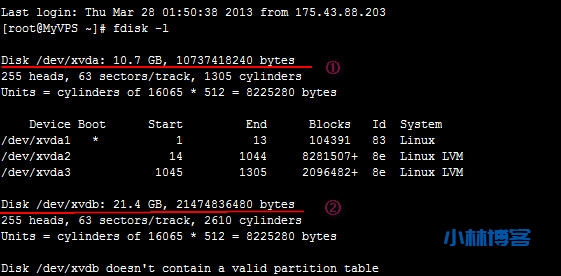 如图,①为a盘,是系统盘,是一个已经默认挂载的硬盘,容量10.7G,②为b盘,未使用(未挂载)的一个硬盘,容量为21.4G,接下来就是要对这21.4G的硬盘进行扩容到a盘。如果使用df -h命令看到b盘已经被挂载了,那么也不能将b盘扩容到a盘。