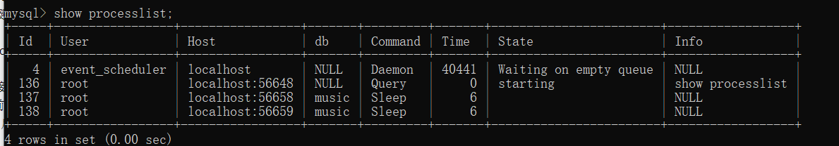 连接成功mysql后,后续如果没有操作,本次连接就会处于空闲(Sleep)状态,你可以在 show processlist 命令中看到它