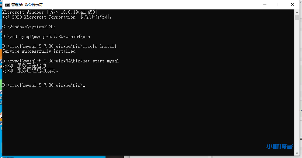 一切准备好之后进入命令提示符,一定要选择管理员权限进入,然后cd进入到mysql安装文件目录D:\mysql\mysql-5.7.30-winx64\bin,输入下面初始化指令