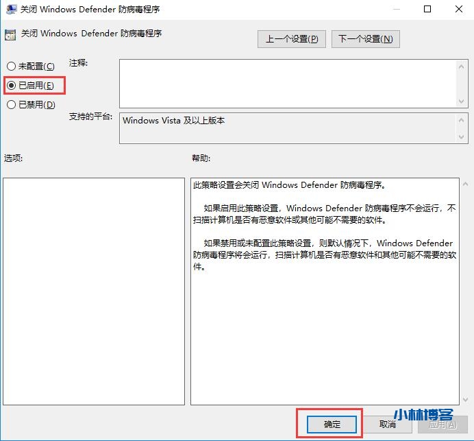第三步:双击打开关闭Windows Defender防病毒程序,然后改为已启用,然后点击确认