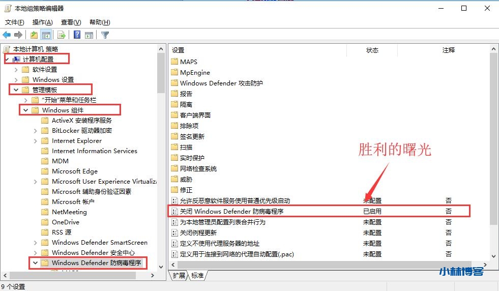 第二步:管理模板=》Windows组件=》Windows Defender防病毒程序=》关闭Windows Defender 防病毒程序