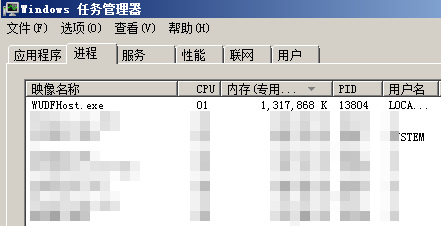 不小心一看资源管理器,发现WUDFHost.exe占用了1G多的内存,先直接结束进程,WUDFHost.exe进程又会重新出现,只会占用2M左右的内存,但随着时间推移,它又慢慢会占用到几百兆内存,然后又到1G多,已经发现两次这样的情况了,我记得以前并没有这样(我有随时查看资源占用情况的习惯),这是什么原因造成的?现在不得而知。
