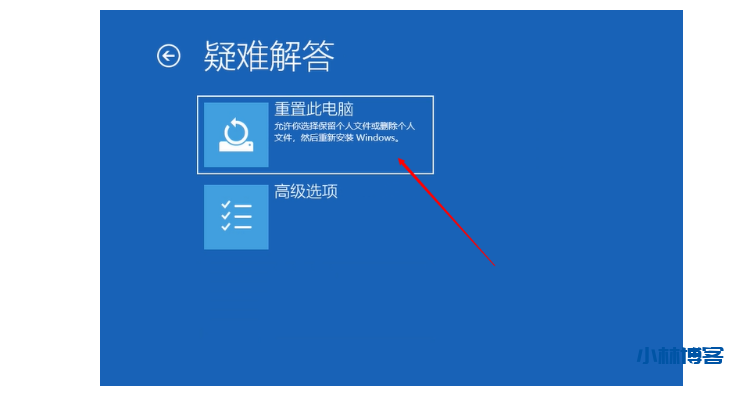 无法进入系统的情况下,长按电源键强制关机,再重启,连续三次及以上时,进入选择一个选项界面,点击疑难解答,重置此电脑.