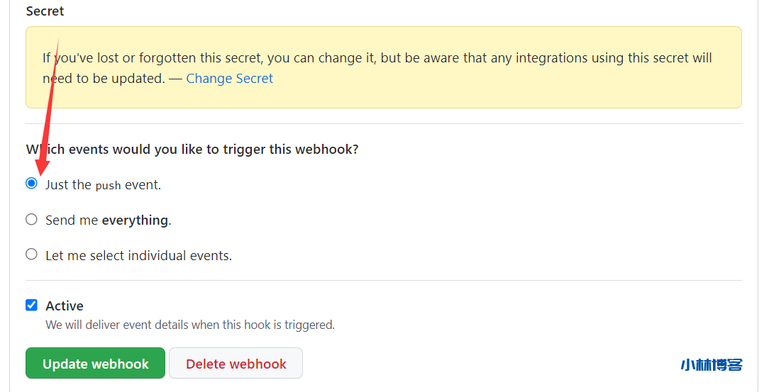 其中 Payload URL 写 http://test.com:1234/webhook ,”test.com”最好写自己服务器的公网IP。