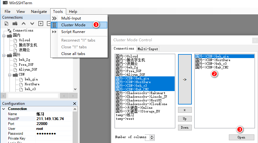 打开Tools - Cluster Mode - 选中需要批量执行的服务器 - 点击Open进行打开,然后就可以在Scripts对打开的服务器执行命令。