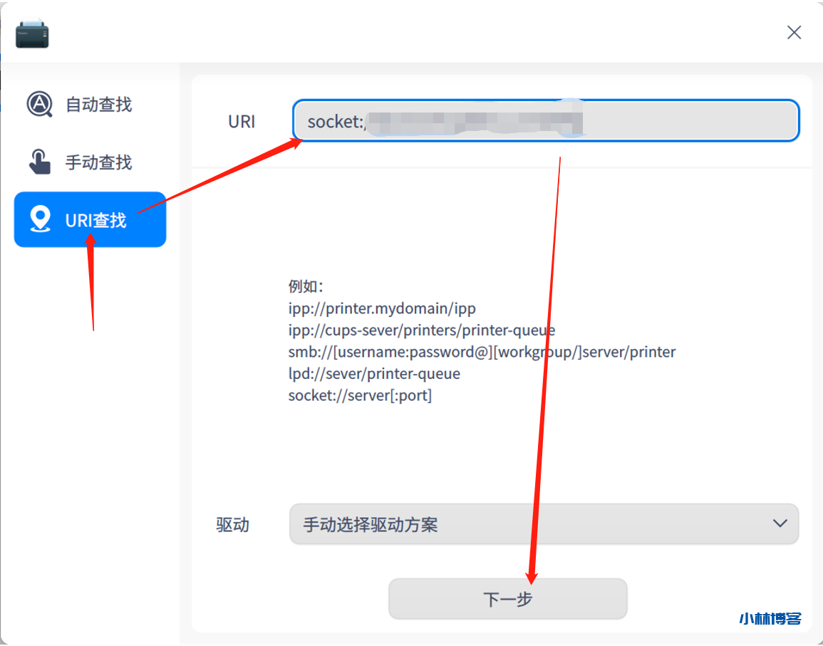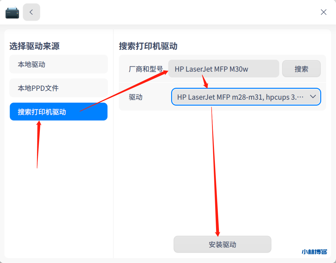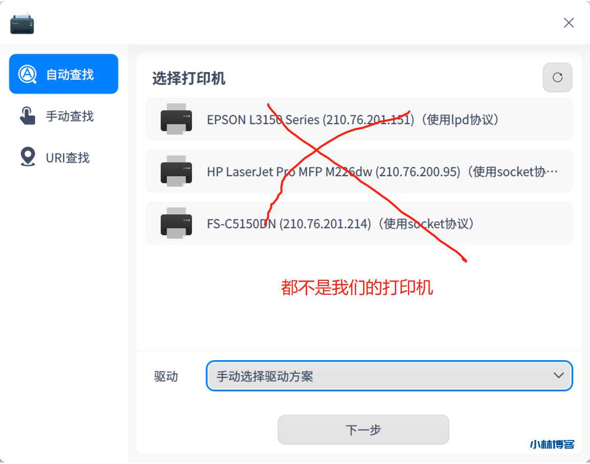 打开Deepin系统默认的打印管理器(在启动器(相当于Win中的开始菜单)中搜索即可找到),如下图所示,点击打印机设备后面的+开始配置; 软件首先会进行自动查找,这个过程自动开始并很快完成,但显示的一些网络上的打印机都不是我们的,如图所示: 点击进入URI查找,输入socket://ab.lab.cn:12345,如图所示,点击下一步; 接下来选择驱动来源,直接进入左边第三项搜索打印机驱动,输入型号HP LaserJet MFP M30w,点击搜索,选择搜索到的驱动中HP LaserJet MFP M28-M31那个,如图所示,点击安装驱动; 已经成功了,可以查看打印机 赞微海报分享
