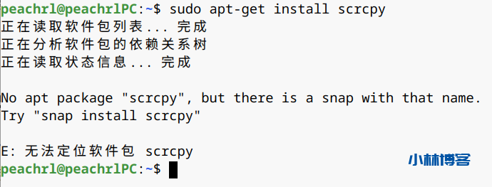 我们直接尝试用sudo apt-get install scrcpy命令安装,但是失败了: