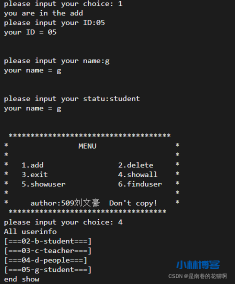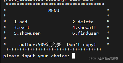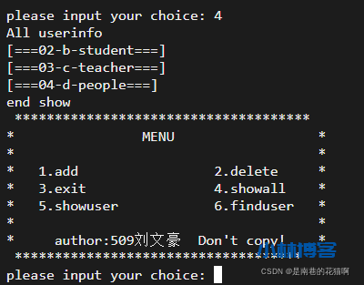 function add(){sh addsleep 1}function delete(){sh deletesleep 1}function showall(){echo "All userinfo"for line in `cat passwd.txt`doecho "[===$line===]"doneecho "end show"sleep 1}function showuser(){echo "All ID and name"for line in `cat passwd.txt`doOLD_IFS="$IFS" #保存旧的分隔符IFS="-"arr=($line)IFS="$OLD_IFS" # 将IFS恢复成原来的echo "[**ID=${arr[0]}**name=${arr[1]}**]"doneecho "end show"sleep 1}function finduser(){echo "查询并显示特定用户的记录"read -t 30 -p "please input you want to find ID:" IDfor line in `cat passwd.txt`doOLD_IFS="$IFS" #保存旧的分隔符IFS="-"arr=($line)IFS="$OLD_IFS" # 将IFS恢复成原来的if [ ${arr[0]} -eq $ID ]thenecho "[**ID=${arr[0]}**name=${arr[1]}**statu=${arr[2]}**]"fidoneecho "end show"sleep 1}function menu(){cat << EOF************************************** MENU ** ** 1.add 2.delete ** 3.exit 4.showall ** 5.showuser 6.finduser ** ** author:509刘文豪 Don't copy! *************************************EOF}function usage(){read -p "please input your choice: " choicecase $choice in1)add;;2)delete;;3)exit 0;;4)showall;;5)showuser;;6)finduser;;esac}function main(){while truedomenuusagedone}main