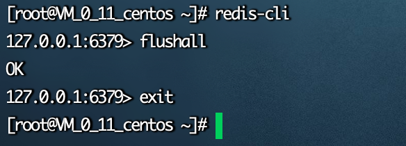 [root@VM_0_11_centos ~]# redis-cli127.0.0.1:6379> flushallOK127.0.0.1:6379> exit[root@VM_0_11_centos ~]#