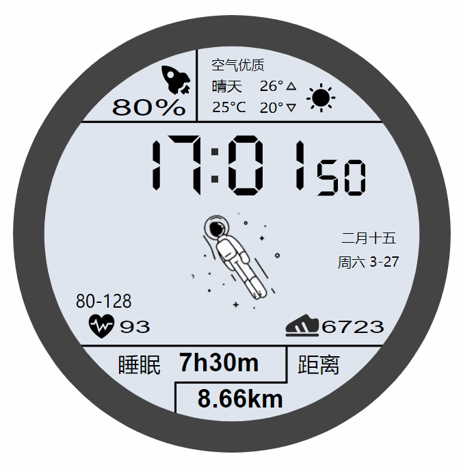 华为手表太空人表盘最近在抖音等短视频平台很火爆,今天给大家分享一款HTML模拟的华为手表太空人表盘,下载后直接解压放在服务器上访问就可以,本地也可用浏览器打开查看。