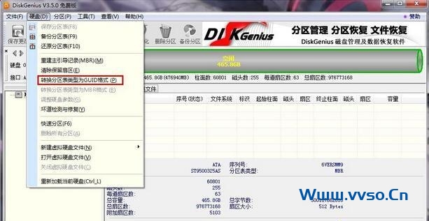2、打开磁盘分区工具,比如DiskGenius,将硬盘分区表转换成GPT格式。