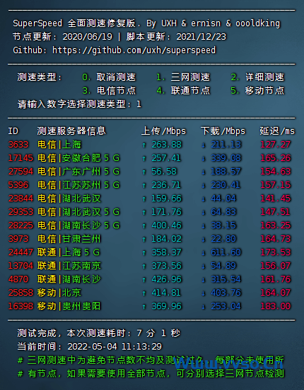 用来检测服务器到国内三网运营商速度的一键脚本 SuperSpeed 修复版,很方便,可以测速你的服务器到国内各大节点的速度。如果单纯想测试服务器速度的话,这个脚本十分不错,这里上个今天测试的截图,共小伙伴们参考: