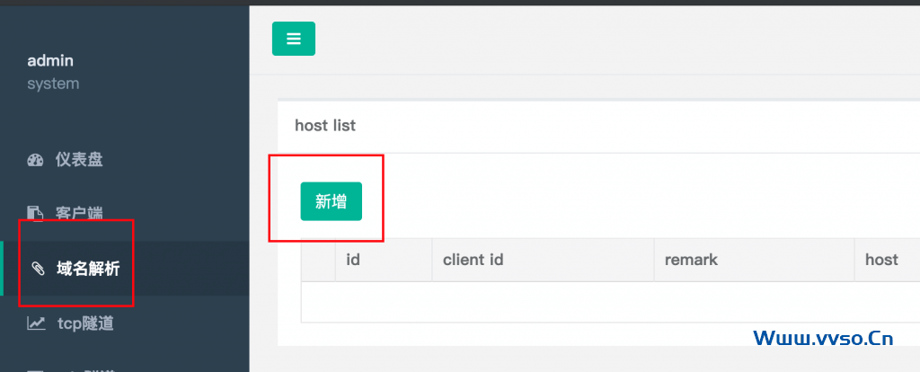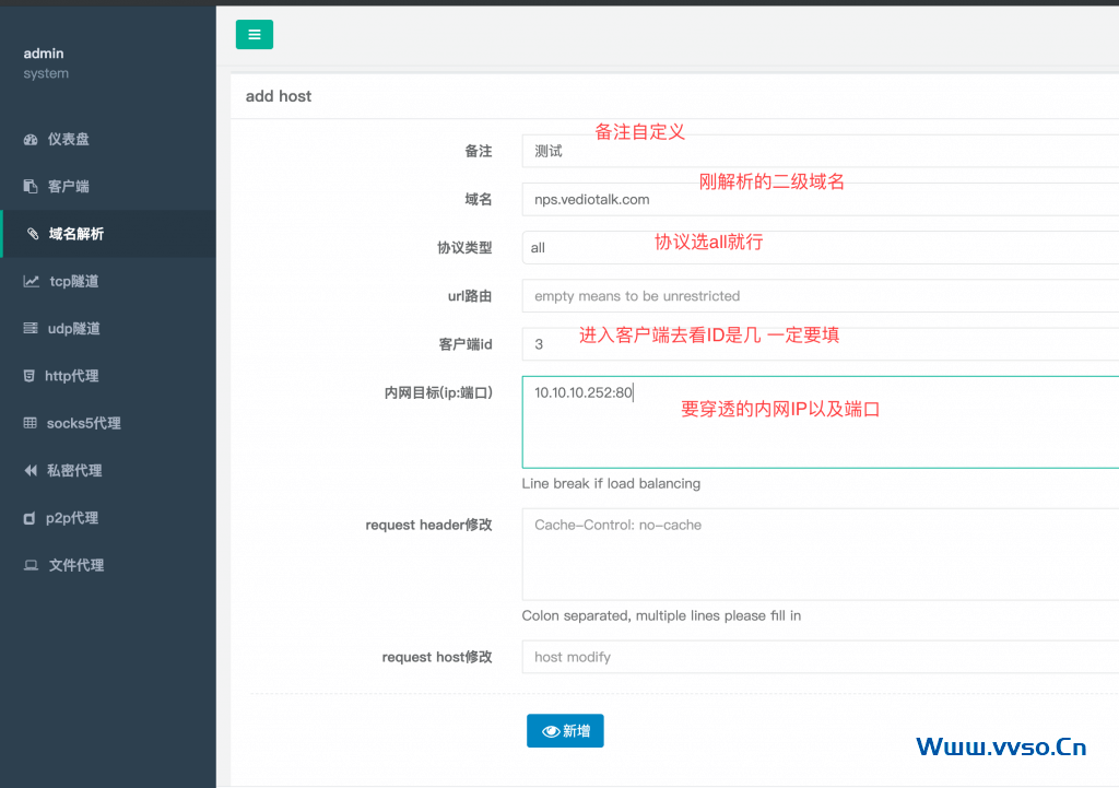 2.进入NPS后台绑定域名以及设置内网IP及端口号