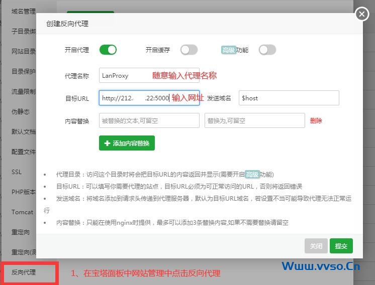 2、直接在宝塔面板中网站管理中点击“反向代理”,创建反向代理如下图: